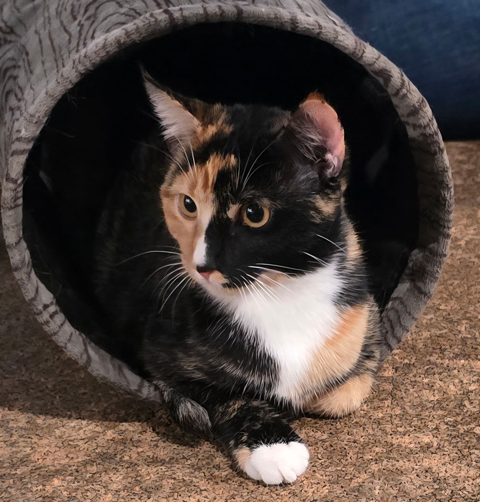 My two years of life have been a hard one so far. Someone abandoned me outside and since I wasn't neutered, I ended up getting in a lot of tussles. That's why I have a cauliflower ear. On top of that, I suffered a leg injury that resulted in my left leg getting so damaged that the doctors decided to amputate it to give me a better life. Now that I'm inside, that doesn't matter. I sometimes forget that I'm missing that leg and topple over when I try to stand on my hind legs. And when I grab on to a kick toy, you'll see me want to start kicking with the missing leg. The people here think it's cute. And I enjoy entertaining them. Come see me and see if you want me to amble into your home.