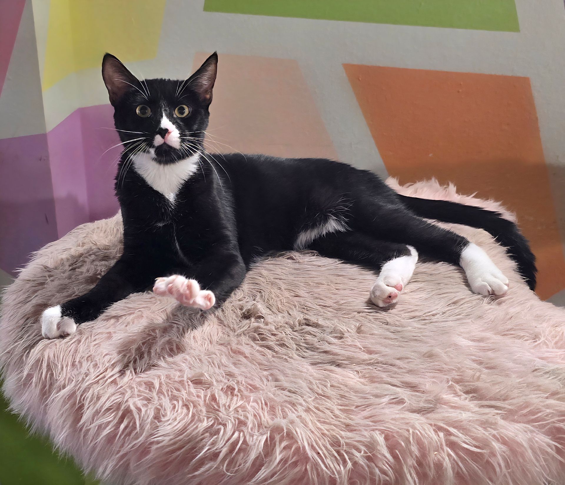 If you're looking for a cat who likes to talk, I'm your boy. That's right. I'm a boy even though I have a name that sure sounds like a girl's name. I demand pets from people who come in to interact with us cats. And when I'm not doing that, you can get me to play by using a wand toy like the people in the cat room tell you. Another thing I like? My sister Smudge. She and I like to snuggle together and hang out with each other when we're not playing. And sometimes, our favorite toy is each other. Come see if I'm the right guy for you and be sure to make room for my sister.